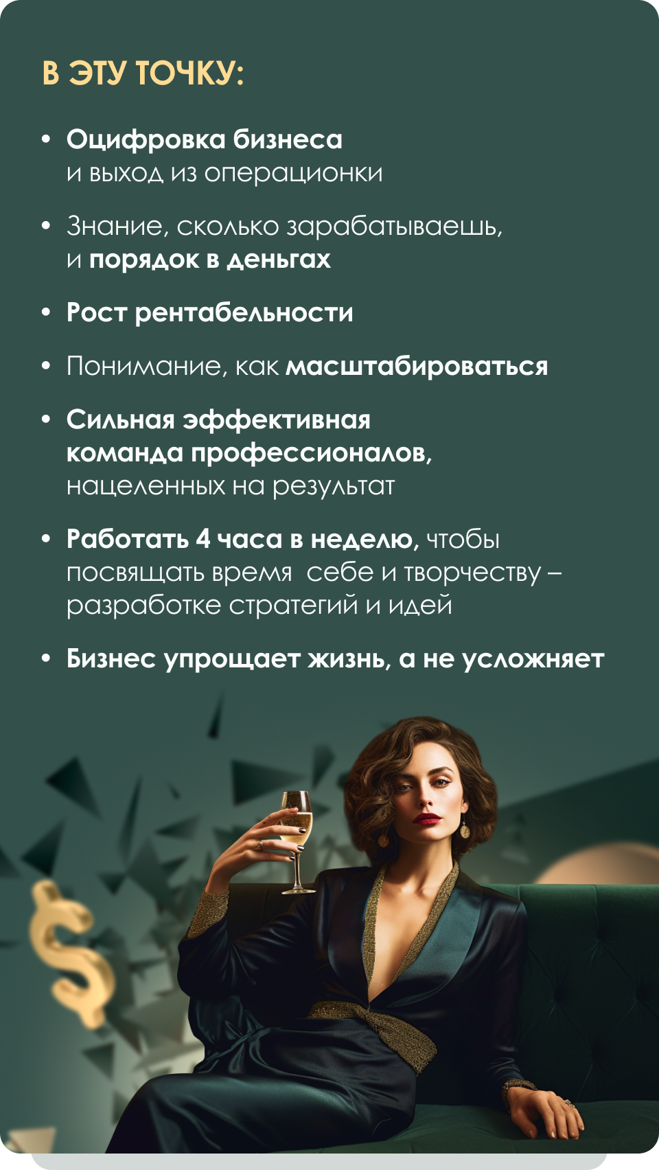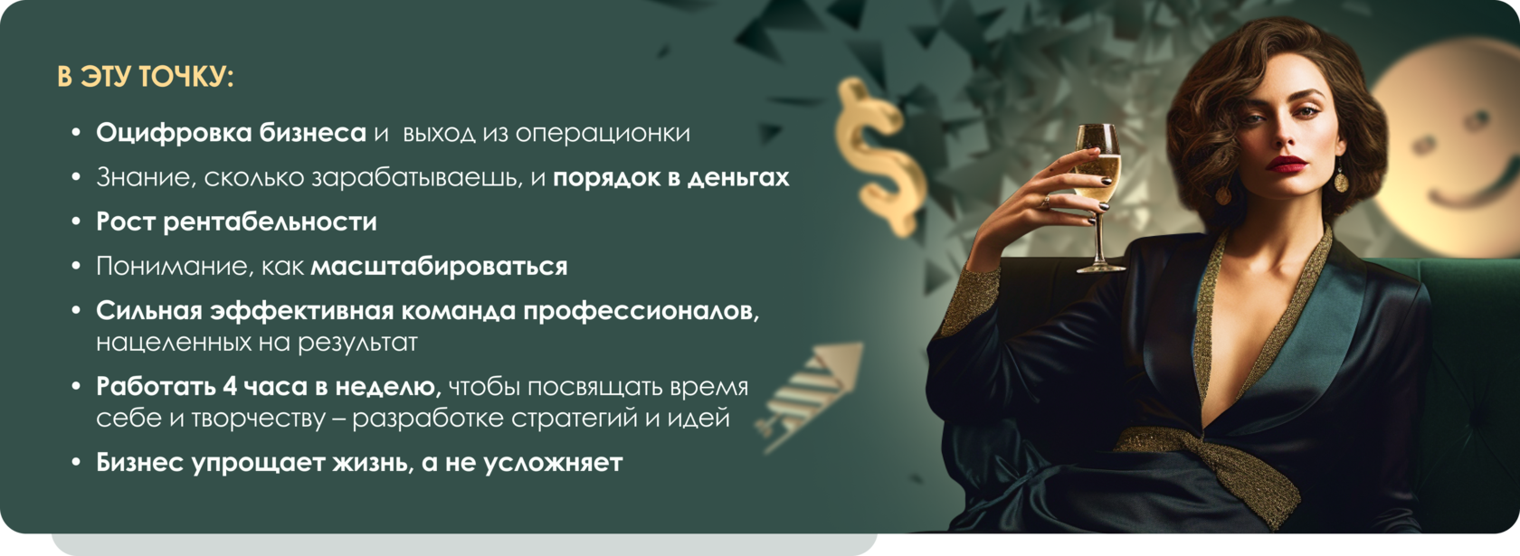 - Наш девиз не просто так звучит как «Свободные. Богаты. Счастливые.» Вы ощутите, как появилось в два раза больше времени на себя и творчество (никакой операционки – креатив и стратегии!). Увидите, что прибыль увеличилась. Почувствуете любовь к своему делу, а не усталость и отвращение.